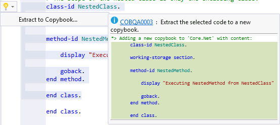 You can use the Extract to Copybook quick action as an alternative to the Extract to Copybook context menu command in the editor:
