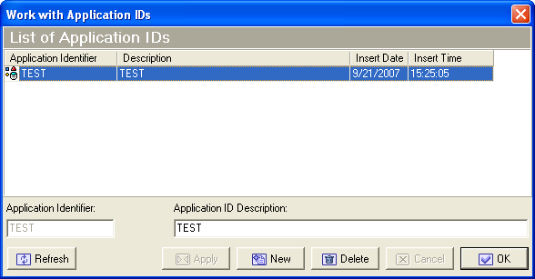 This section describes the columns and fields listed in the Work with Application IDs area as shown below: