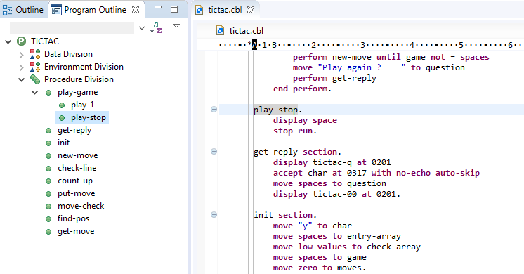 • The Outline view shows the structure of the file you are editing. This view enables you to navigate around the file. For example, if you want to go to a particular COBOL section or a data item in the Editor view, just click on it in the Outline view.