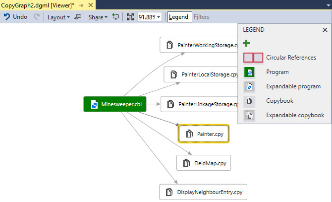 This opens the copybook graph for the file in the DGML editor that visualizes the copybook dependencies of the file.