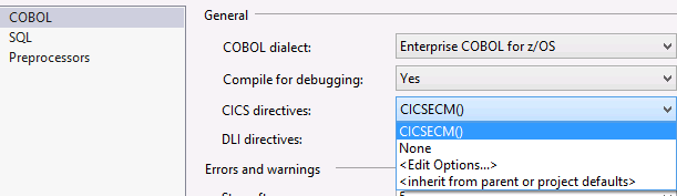 Notice that CICS Directives is set to CICSECM(). This has been set when you added the file to the project or performed a directives scan of the COBOL sources in your project.