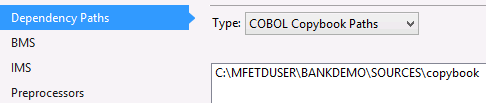 Type should be set to COBOL Copybook Paths. Note that this has C:\MFETDUSER\Bankdemo\Sources\copybook set. This is the folder where the IDE is going to look for the copybook files required by this project.