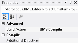 This opens the Visual Studio properties window. Note that the Build Action is set to BMS Compile which means the build invokes the BMS Compiler.