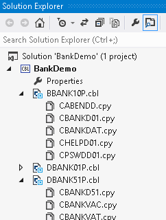 Solution Explorer shows which copybooks are used by your source programs. To view the copybook dependencies of a COBOL program, simply expand the node for that program: