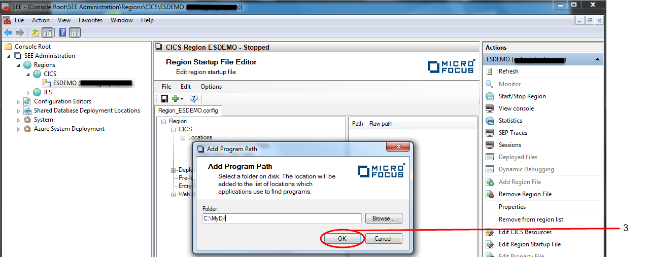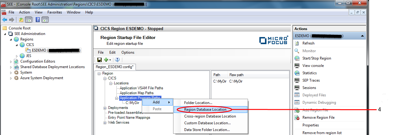 4. To add the region database as a program location, right-click on the Application Program Paths node and choose Add > Region Database Location... from the context menu. See 4 in the diagram below.