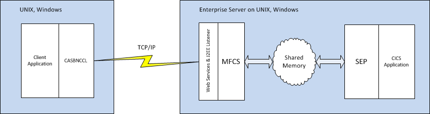 ECI client programs can run on the same machine as the Enterprise Server, or on different physical hardware. Requests are submitted to the target region through the communication layer. If you wish to access a remote server, your programs connect via the Web Services and J2EE listener. The following diagram shows the path of the request from the client to a remote server over TCP/IP: