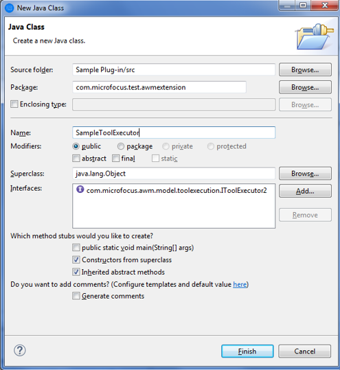 This opens a template Java class for the tool. You need to define the Java class to implement the tool.