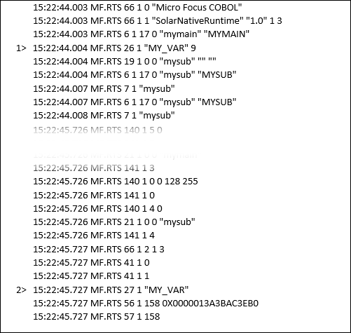 # -MFTRACE Text Emitter- # CommandLine = /opt/microfocus/VisualCOBOL/bin/rts32 mymain # ProcessId = 1646624 # Date = 2017/01/21 # Time = 11:28:09.105 # Operating System = AIX 5.1 # Computer Name = asterix # Format = $(TIME) $(COMPONENT) $(EVENT) $(LEVEL)$(DATA) 11:28:09.105 MF.RTS 128 1 11:28:09.106 MF.RTS 74 1 "5.0.0.12" 11:28:09.135 MF.RTS 129 1 11:28:09.225 MF.RTS 255 3 173 1 "myprog" 11:28:09.226 MF.RTS 130 1 11:28:09.226 MF.RTS 131 1