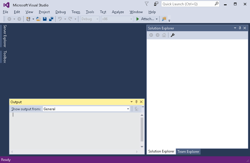 The large pane is where your solutions and projects will be opened. At the moment, this shows the Start Page, with up-to-date information on Visual Studio. When you start work, this is the pane where your code is displayed.
