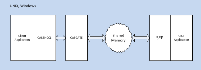 ECI entry points such as CICSEXTERNALCALL are exposed by the casbnccl module which is supplied as a dynamic load library on Windows and a callable shared object on UNIX and Linux platforms.