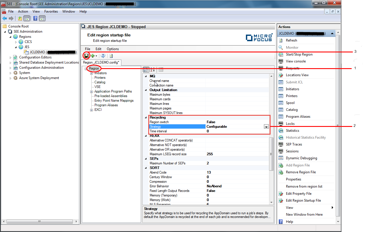 3. Locate the Recycling category in the properties window and select the Strategy property. If the property's Default value is selected, this will result in the AppDomain used to run a job's steps to be recycled at the end of each job. If the property's Configurable value is selected, you can then additionally specify the time period after which the job steps AppDomain is recycled, or whether the AppDomain is recycled after a region switch. If neither a time period nor a region switch are specified, the job steps AppDomain will only be unloaded when a seesys -recycle|-phasein command is run. See number 2 in the diagram below.
