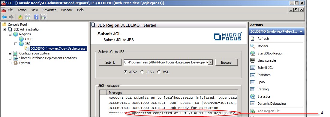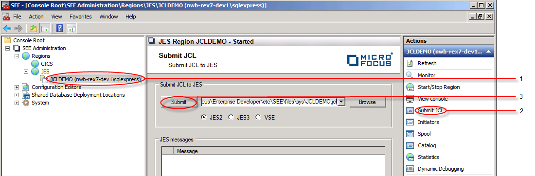 The selected JCL file is submitted to the JCLDEMO region. Messages are now displayed to show the progress of the job submission. A final confirmation message is displayed to indicate that the job has been successfully submitted and is ready for execution. See 4 in the diagram below.