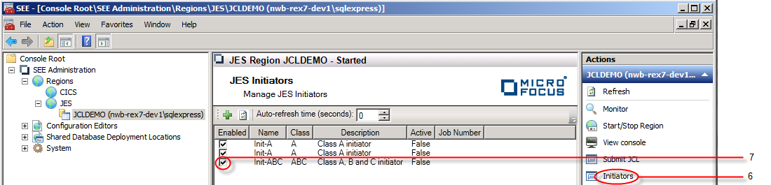 The Initiators view is displayed. Click on the check box next to the initiator named Init-ABC to enable it. See 7 in the diagram below.