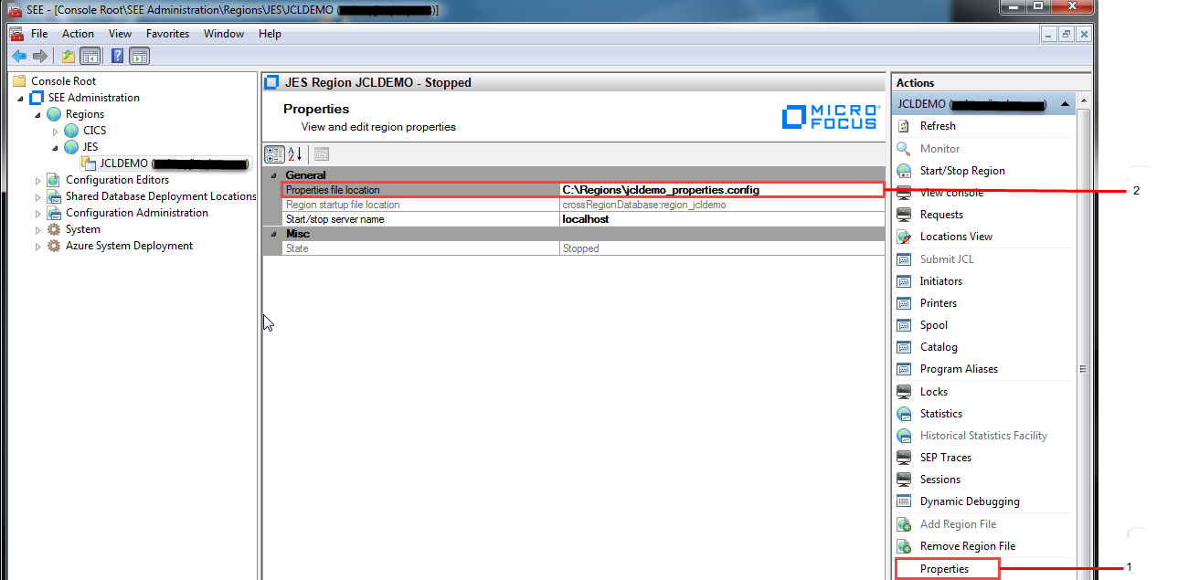 Properties file location item, and use the browse button to locate and select the properties file to be associated with the region. See