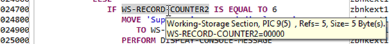 You can use the COBOL Source Information (CSI) functionality and its Quick Browse dialog to obtain information about your program when you are debugging it. This example shows details for data items starting WS-, such as the name, definition, and amount of times each item occurs in the program.