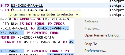 You can change your Eclipse preferences and rename without the Rename COBOL Element dialog box. To do this, go to Window > Preferences > Micro Focus > COBOL > Editor and uncheck Rename in editor without dialog.
