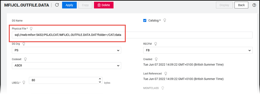 The example shown above creates a catalog.dat file, if one does not already exist, within the CAT folder in the PGJCLCAT datastore. The Default Allocated Dataset Location setting creates a sub-folder from the location of the catalog file for any cataloged data sets. These two options form the values of the MFSYSCAT and MFALLOC_LOC environment variables respectively.