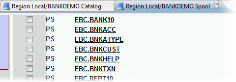 EBC.BNKACC) in the list. This displays the DCB information for this catalog item.