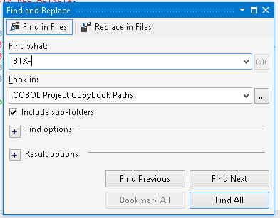 Locate Definition, in the COBOL toolbar and start typing a search term: