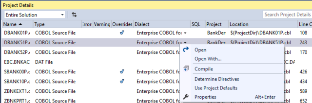 The Project Details window shows a list of all files in your project or in the entire solution together, explore details such as the file type, location, COBOL dialect, number of errors or warnings and whether there are file directives that differ from and override the directives set on project level. This can help you identify problems quickly. To open the window: