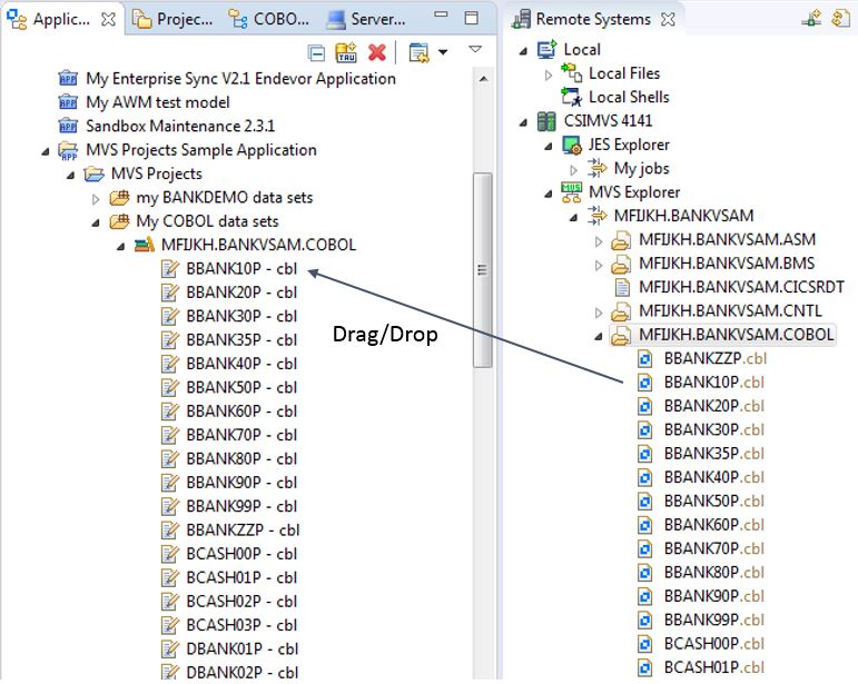 3. Now drag and drop BBANK10P from the MVS Explorer onto the COBOL folder in the Application Explorer view.