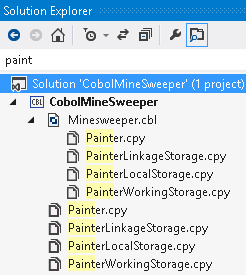 You can use the search field in Solution Explorer to search for files in your solution. Searching also finds copybooks in the copybook dependency view even if they are not part of any of the projects in the solution:
