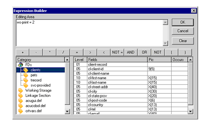 The Expression Builder is a graphical interface that you can use to build print conditions. Click data elements and expression symbols to construct a condition statement. When AcuBench generates the code, this expression is added to an IF statement used to determine whether or not the given report element should be printed.
