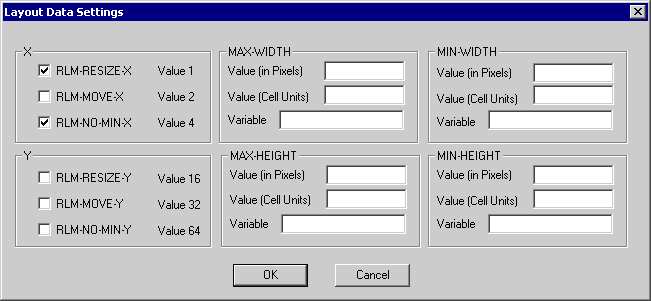 Note that you can set either a resize or a move value for each axis (x or y), but you cannot set both values for any axis. Minimum and maximum dimensions for a control (height and width) are also set in this dialog box. See Minimum and Maximum Control Dimensions for detailed information about these settings.
