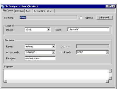 When the File Designer opens, the File Control tab is selected by default. This tab is used to construct most of the SELECT statement that will be generated into the associated .sl COPY file. (Key information is entered in a different File Designer tab). Selections made and information entered in this interface must conform to the ACUCOBOL-GT rules for a File-Control paragraph SELECT statement. See Environment Division for more information.