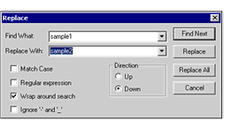 See Find for more information about the check-box and radio button options at the bottom of the Replace interface.