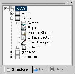 Only COBOL programs that have a program structure file appear in the workspace Structure view. The Structure view displays access points to program areas that have a corresponding workbench development tool, such as screens (Screen Designer), reports (Report Composer), Working-Storage (Working Storage Editor), Linkage section (Linkage Section Editor), Event paragraphs (Event Editor), and data sets (Data Set Designer).