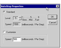 Auto Step lets you execute step commands repeatedly until the program’s end. You can change the speed at which the command executes, from 1 (slowest, approximately 3 seconds per step) to 9 (fastest, several steps per second). When you select a speed level in the Standard area of the dialog, the actual speed is displayed in milliseconds per step. You can also use the Customize area to set a custom speed, specified in milliseconds per step.