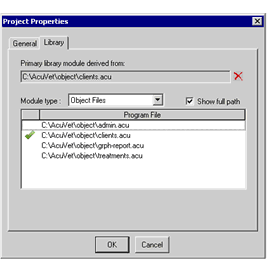 An object library is a file that contains a group of one or more compiled ACUCOBOL-GT programs and its associated resource files (such as bitmaps and WAV files). Ordinarily, if you wanted to create an object library, you would invoke cblutil, the object file utility (discussed in Working with ACUCOBOL-GT Utilities and Compiler and Runtime). If, however, you want to automatically create an object library every time you build a project, you can use the Library tab of the Project Settings window to define the modules of that library file.