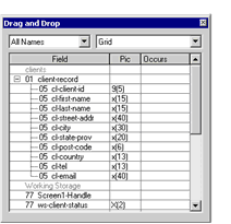 If you have defined one or more data sets within your program, as discussed in Working with Data at the Program Level, the data items from the corresponding FD are listed in the Screen Designer Drag and Drop pop-up window. This window also lists Working-Storage, Linkage, and other data items defined in your program.
