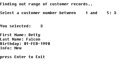 Compile and run the select1 program to find the range of customer numbers in the customer table, prompt the user for a customer number, and then retrieve that record. Remember to compile and run the create program before running select1.