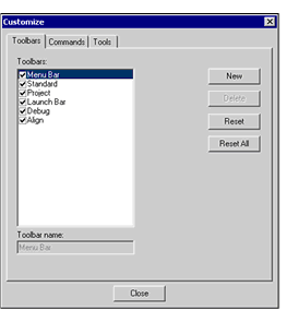 The Toolbars tab allows you to create, delete, or reset a toolbar. It also provides an alternate mechanism for controlling which toolbars are hidden or displayed.