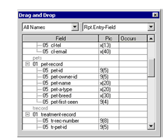 As in the Screen Designer, if the data used to populate your report resides in graphical Working-Storage, data files described by a data layout file and data set, or AcuBench-recognized COPY files, you can use the Drag-and-Drop interface to add controls to your report. When you use this method to create controls, the controls are automatically associated with the selected data item(s).