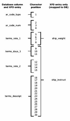 For example, if your program has one file with the three records shown below, the underlined fields will be included as fields in the XFD file by default (this example assumes that ar-codes-key is named in a KEY IS phrase). Some fields will not appear by name in the file, but will be mapped to the master field names. The interface thus will eliminate redundancies and give you optimum performance.