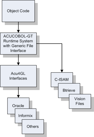 ACUCOBOL-GT also includes a generic architecture for connecting to file systems. This means that developers can choose from a variety of file systems and database management systems, as shown in the following diagram: