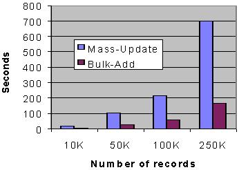 Notice how the run times for MASS-UPDATE mode rise at a much steeper rate than those for bulk addition mode as the number of records grows.