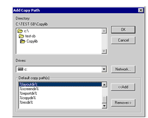 By default, COPYPATH is set to the relative paths of the project’s screen, COPY, resource, and layout (FD) folders, as well as the absolute path to the ACUCOBOL-GT sample directory and its .def (COPY files) folder (C:\Program Files\Micro Focus\extend x.x.x\AcuGT\sample\def, for example).