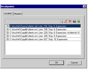 You can also set, modify, and delete breakpoints using the Breakpoints dialog box. To do this, select Breakpoints from the Debug menu.