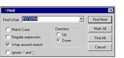 The Find What combo box displays the string to be used in the search. If text is selected in the editor when you open the Find dialog, that text will appear selected in the combo box. If you are performing multiple searches, you can expand the combo box to see and select from a list of up to 15 previous search terms. You can also type the search term that you would like to use in this field.