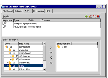 If you are creating a data layout for an indexed file, you can use the File Designer's Key tab to specify one or more keys. Rules for primary and alternate keys can be found in Environment Division.