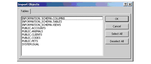 For example, the following Microsoft Query Add Tables screen shows a partial list of the catalog tables that appear under PUBLIC for the sample veterinarian database:
