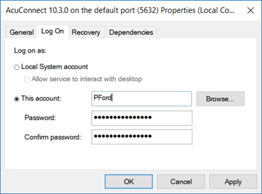 A solution to this issue is to start your AcuConnect service with sufficient user permissions required by the server. You do this by specifying the correct credentials on the Log On tab of the AcuConnect service's properties:
