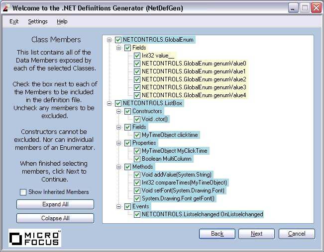 The Tree View shows the Data Members (constructors, methods. fields, properties, and events) for the selected classes. By default, all members are selected. Uncheck the boxes next to any members you do not need in your COBOL application.