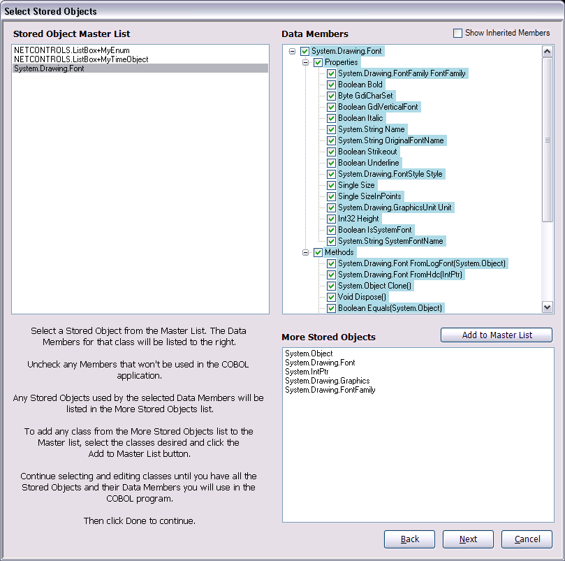 Show Inherited Members Checking this box will display all data members that are inherited from every ancestor. This will usually add a massive number of data members to the list. Use this option if a property, method, etc. that you want to use in your COBOL application is inherited from a parent class.