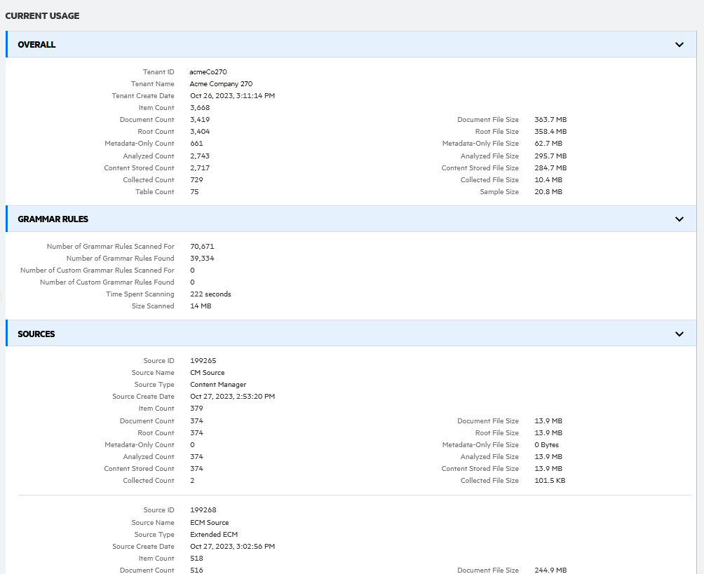 View overall total counts and size of managed data, total grammar rules scanned for and found, as well as total counts and size for each source defined in Fusion. To open or close a section for easy viewing, click the collapse or expand icon for the desired section.