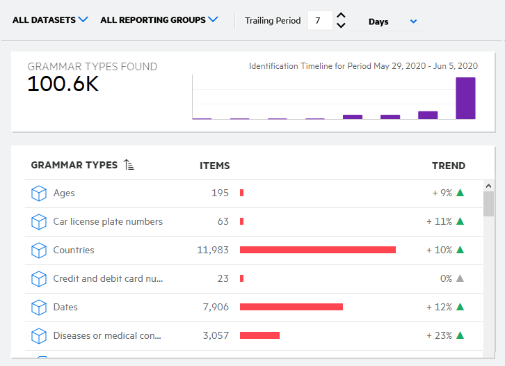 The Grammar Analysis Trend dashboard for unstructured data depicts the volume of sensitive data under management. Content is identified by the grammars that are applied as content is processed. You can see the number of items tagged per grammar type as well as the trend for the selected time period.